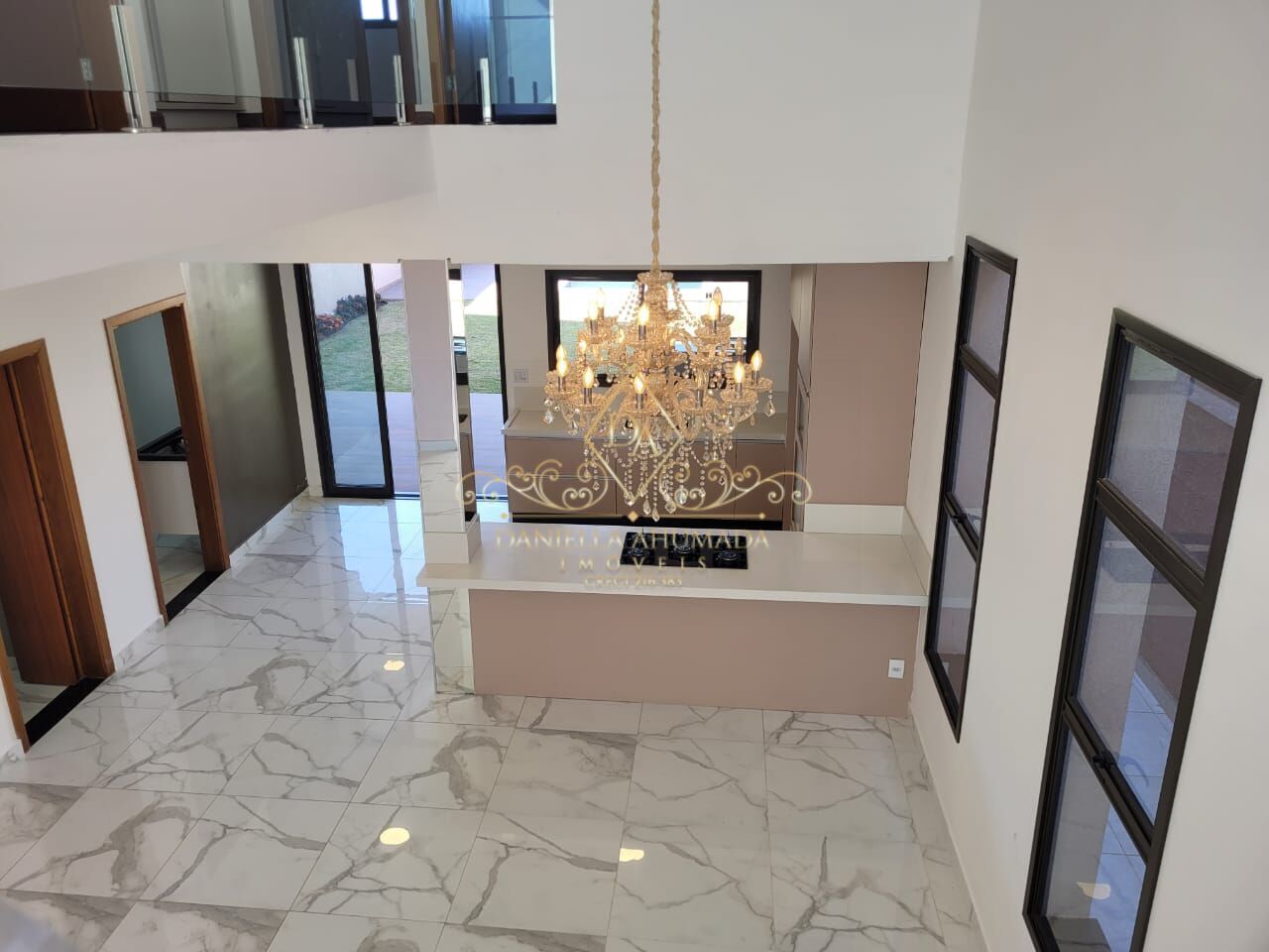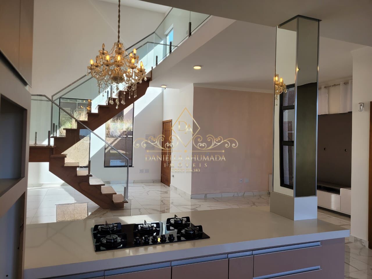 - A sala de estar com pé direito alto também é equipada com alguns móveis planejados, incluindo um rack e painel para a TV, para otimizar o conforto e a experiência de assistir TV e um belo lustre diferenciado proporcionando uma ar de sofisticação par ao ambiente