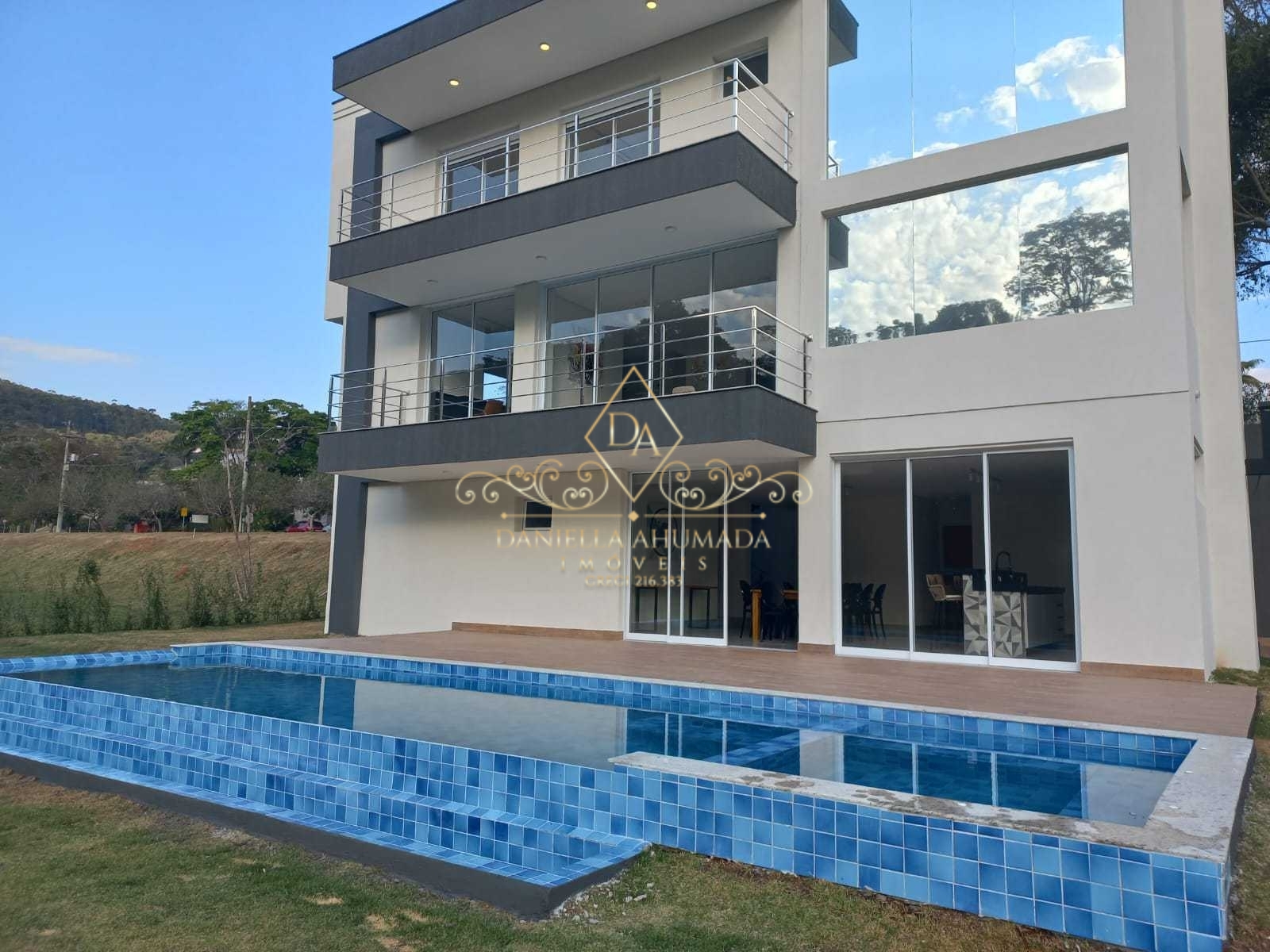 Mansão no condomínio Porto Atibaia com 5 suites, sendo 2 master, todas com armários planejados e ar condicionado, persianas automatizadas, sala de TV, escritório, sala de estar com lareira pé direito 7m, sala de jantar, cozinha planejada com península e 6 banquetas, dispensa, elevador, escada em madeira e estrutura metalica, área gourmet incrível com churrasqueira, forno a lenha e forno de pizza, sala de cinema, adega, piscina em alvenaria com spa e borda infinita, gramado enorme com aproximadamente 400m2!!! Garagem para 4 carros e rampa lateral para acesso de carros no jardim!!!