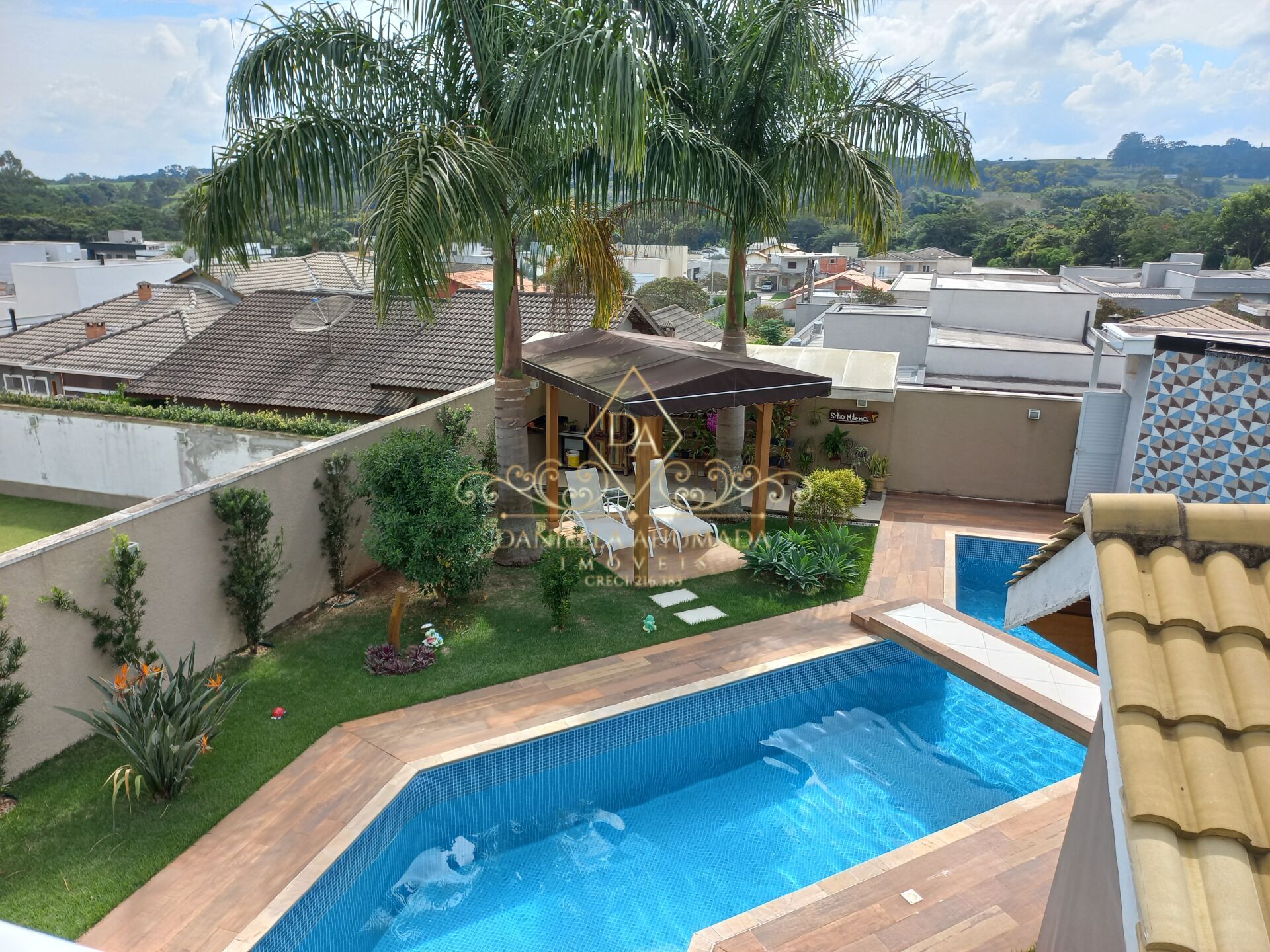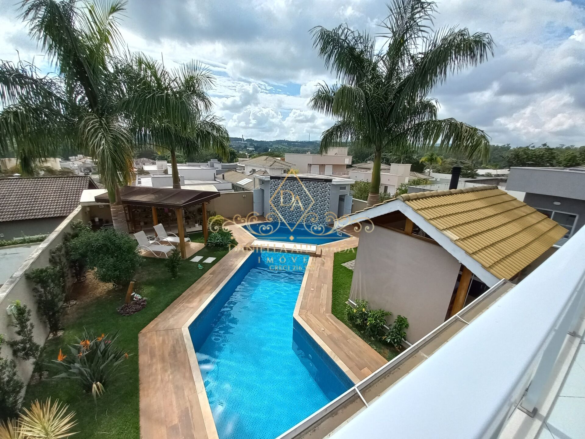 Piscina espetacular com parte coberta integrada junto às salas de estar com lareira, de jogos e linda cozinha toda planejada.